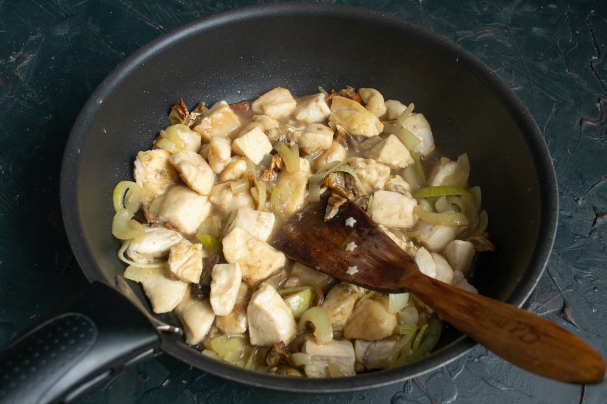 К обжаренной курице добавляем грибы с луком. Обжариваем всё вместе на сильном огне до тех пор, пока лук не станет совсем мягким, прозрачным, и почти невидимым.