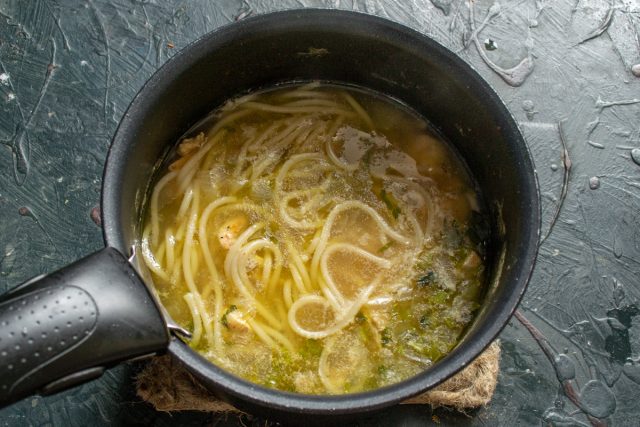 Наливаем 1 литр кипящей воды или кипящего куриного бульона в кастрюлю. Нагреваем до кипения, «топим» спагетти не разламывая. По вкусу солим.