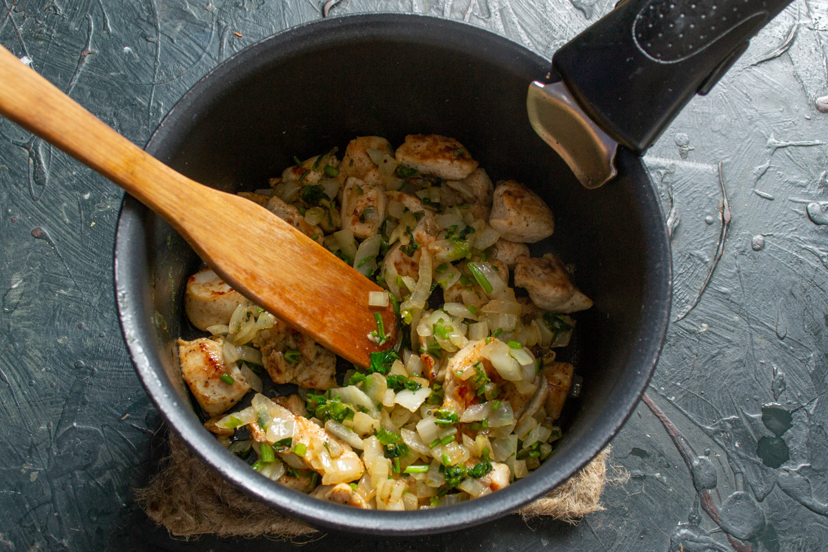 Перекладываем в суповую кастрюлю или глубокий сотейник кусочки обжаренной куриной грудки и лук с петрушкой.