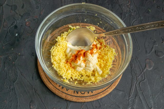 На мелкой тёрке натираем яичные желтки, добавляем к тёртым желткам оставшийся майонез и немного молотой сладкой паприки, смешиваем, чтобы получилась густая, однородная паста. Паприка смешается с желтком, паста получится яркой – отличная идея для украшения закусок.