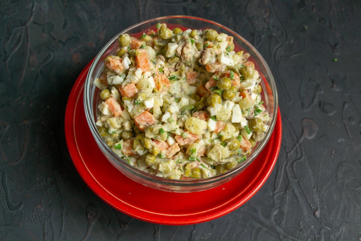Кстати, если вы нарезали ингредиенты, но не приправили майонезом, то поместите в сухую банку или пластиковый контейнер, в таком виде можно хранить до 18 часов. А приправленный майонезом салат не стоит хранить в холодильнике более 9 часов при температуре от 0 до +3 градусов Цельсия.