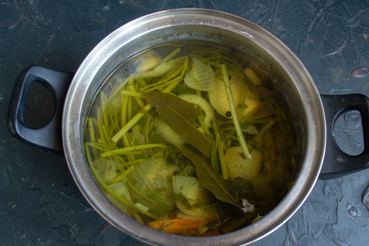 В кастрюлю кладём пучок петрушки, нарезанную луковицу, небольшую морковку, 2-3 лавровых листа и чайную ложку горошин черного перца. Наливаем 1.5 литра горячей воды, нагреваем до кипения и варим овощную основу рыбного бульона примерно 30 минут — 1 час. Готовый бульон процеживаем сквозь сито, зелень и коренья выбрасываем – они отдали в отвар всё необходимое. Солить бульон для этого рыбного супа не нужно!