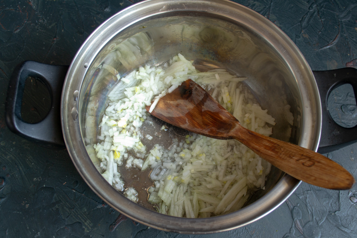 Когда бульон сварится, можно готовить суп. Нарезаем мелко большую луковицу. В кастрюлю с толстым дном наливаем столовую ложку растительного масла, кладём нарезанную луковицу, обжариваем несколько минут на тихом огне, чтобы лук стал мягким.