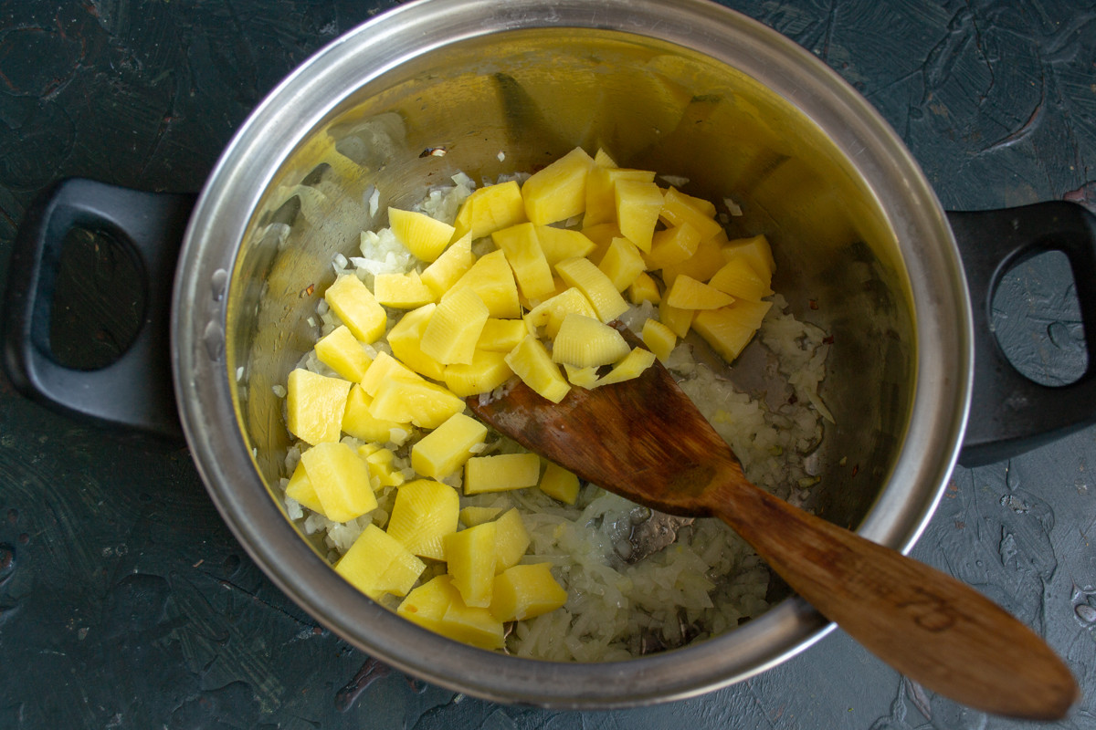 Добавляем к обжаренному луку нарезанную небольшими кубиками картошку.