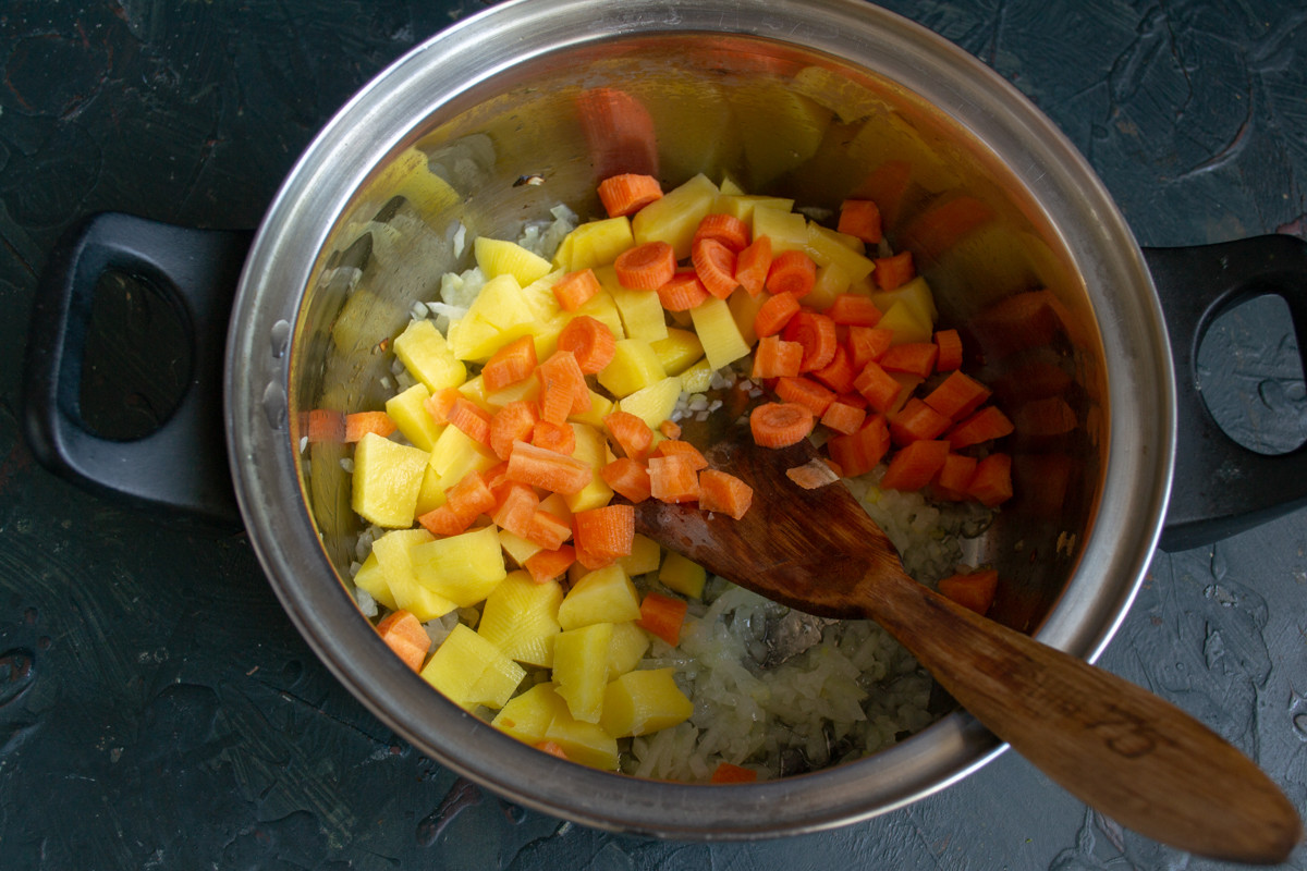 Кладём в кастрюлю нарезанную кружочками морковь.