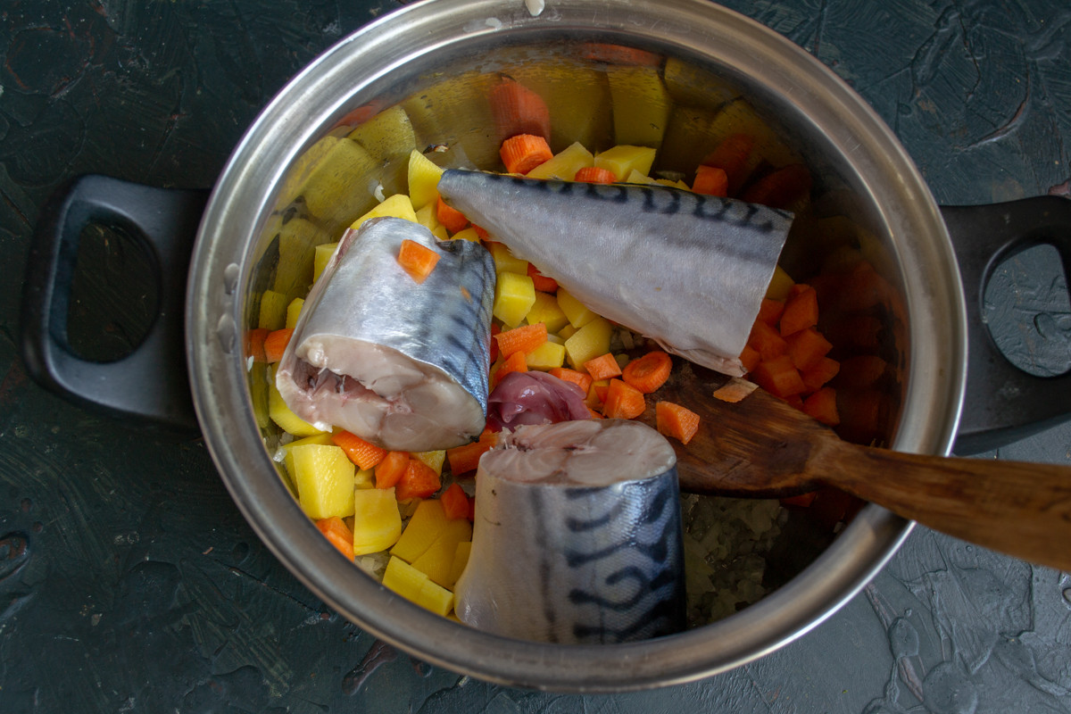 За 30 минут до готовки достаём замороженную рыбу из холодильника, оставляем при комнатной температуре. Отрезаем рыбью голову, разрезаем брюхо. Удаляем внутренности и тёмную полоску крови, расположенную вдоль хребта, снимаем тёмную плёнку изнутри. Тщательно промываем рыбу холодной водой, разрезаем на три части. Кладём куски скумбрии в кастрюлю на овощи.