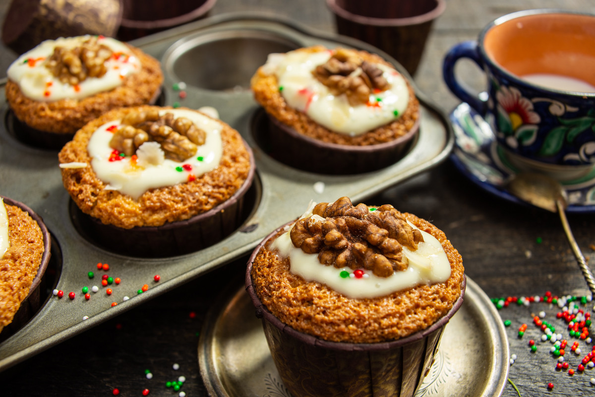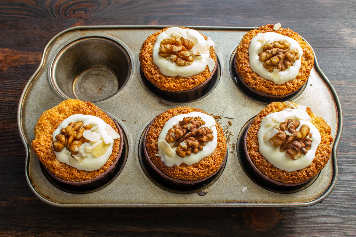 Сверху кладём по половинке грецкого ореха, по желанию украшаем миндальными лепестками и кондитерской посыпкой. Подаем маффины к чаю или кофе. Приятного аппетита.