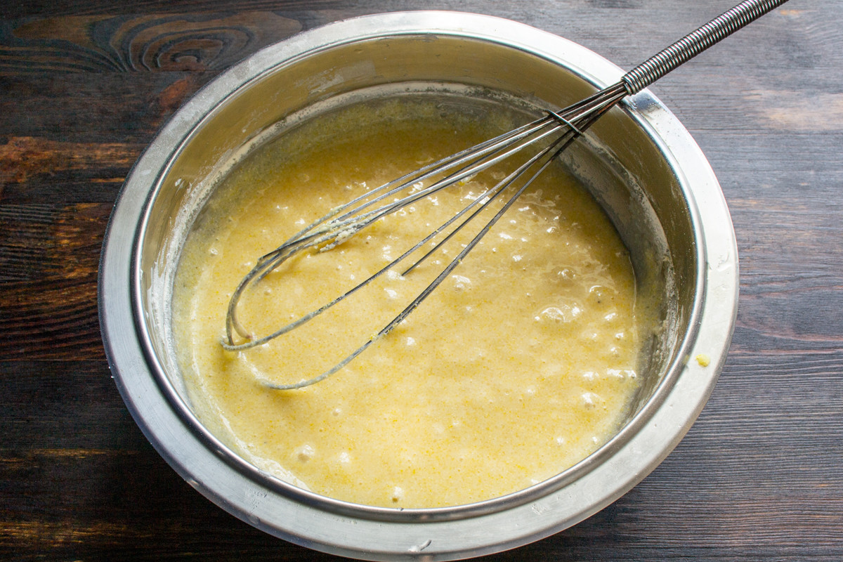 Замешиваем тесто венчиком, если получается чересчур жидким можно добавить дополнительно столовую ложку пшеничной муки.