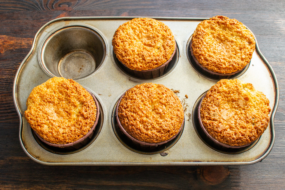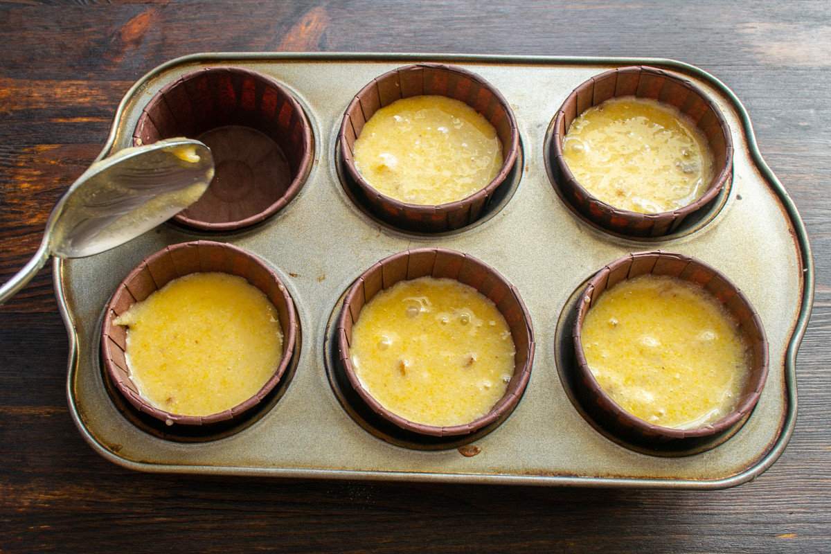В каждую формочку наливаем равные порции теста. Можно отмерять столовой ложкой или взвешивать на весах. Наполняем формочки на 2/3, оставляем место для подъема теста.