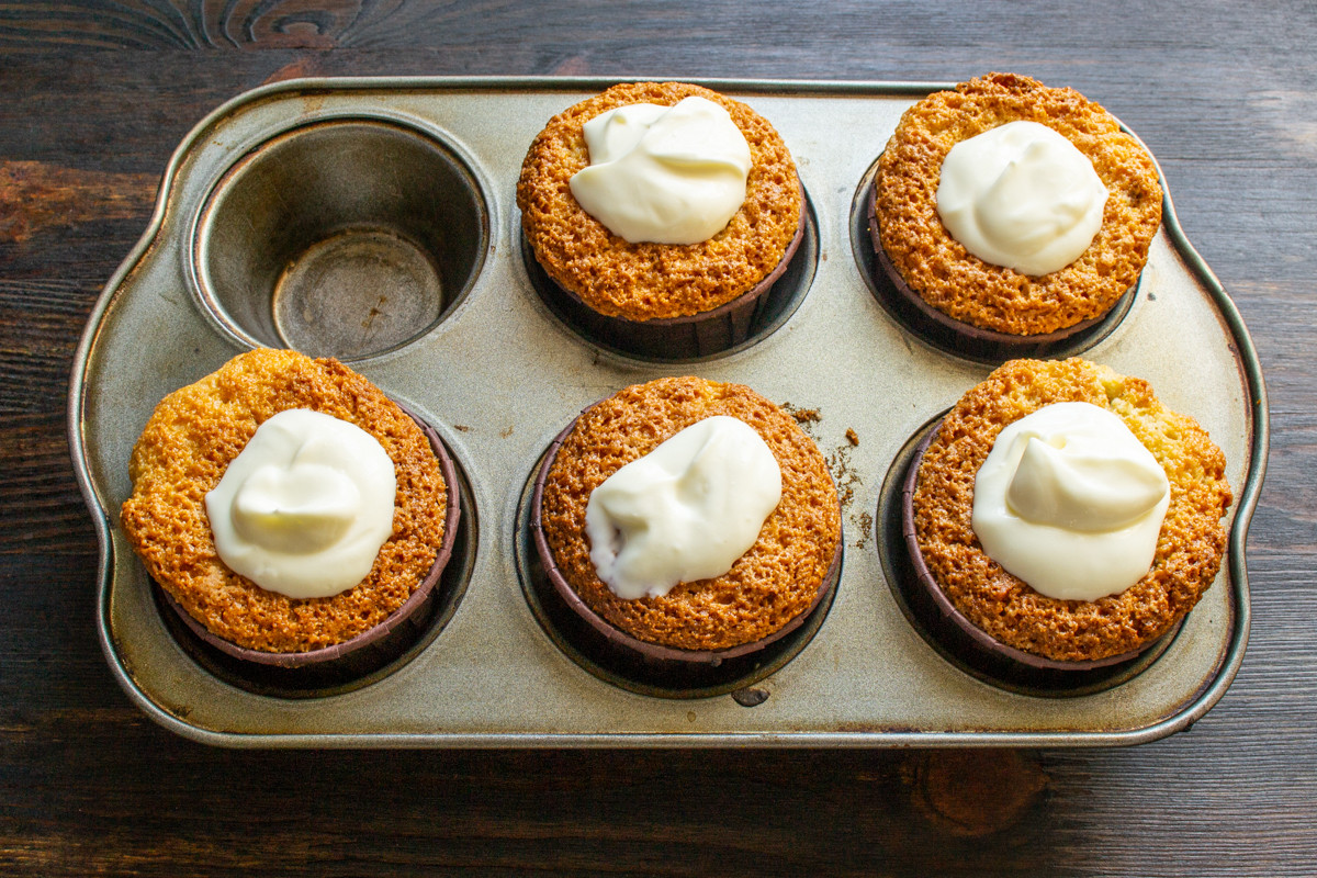 Достаем форму из духовки, даем маффинам остыть. Взбиваем две столовые ложки густой сметаны с сахарной пудрой. Выкладываем сметанный крем на остывшие маффины.
