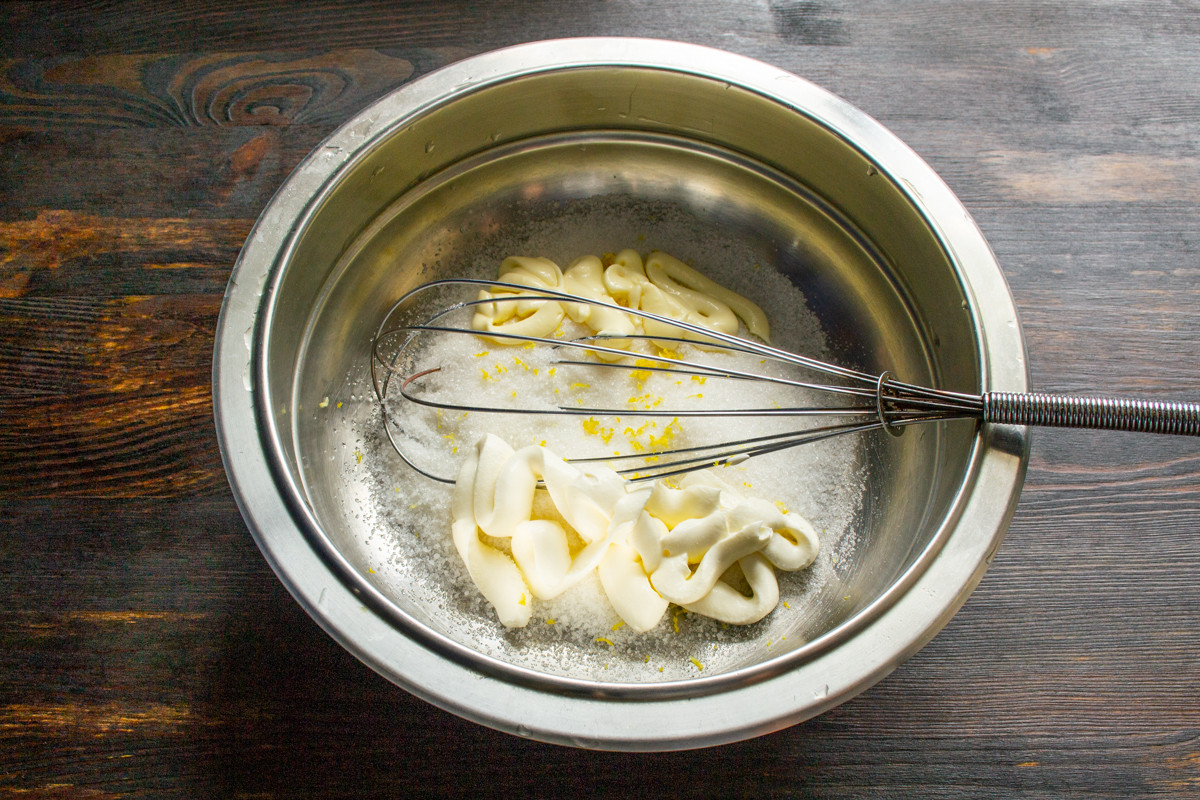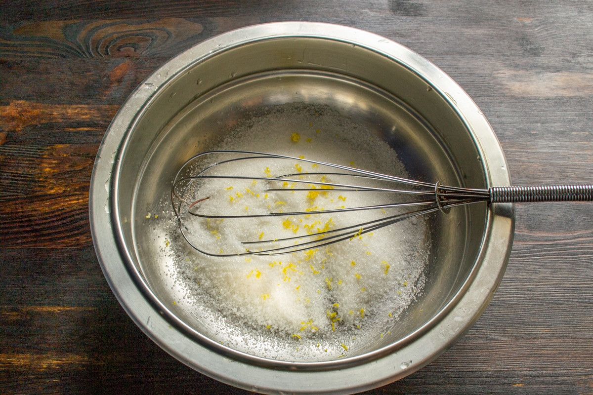 Лимон моем, ошпариваем кипятком. Цедру натираем на мелкой тёрке. Смешиваем сахарный песок с лимонной цедрой. Советую сразу включить духовой шкаф и разогреть его до 170 градусов по Цельсию, это укорит процесс готовки.