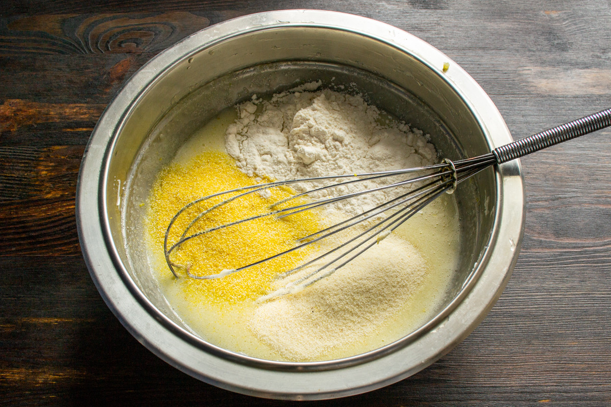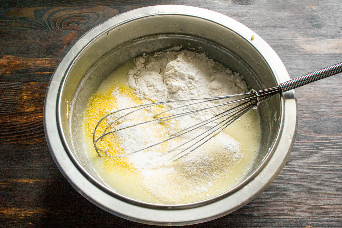 Насыпаем кукурузную муку, манную крупу и пшеничную муку. Используйте кукурузную муку, крупа может не пропечься! Если нет муки, перемелите кукурузную крупу в кофемолке.