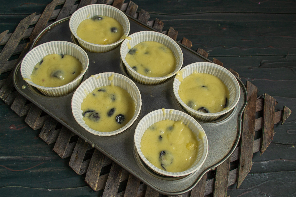 Бумажные капсулы вставляем в металлическую форму с ячейками для выпечки кексов. В каждую формочку наливаем одинаковое количество теста. На один кекс нужно от 65 до 80 граммов теста в зависимости от размера формочки (её нужно заполнить на 2\3).
