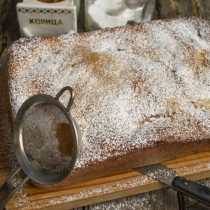 Посыпаем творожную шарлотку сахарной пудрой и молотой корицей через мелкое ситечко.