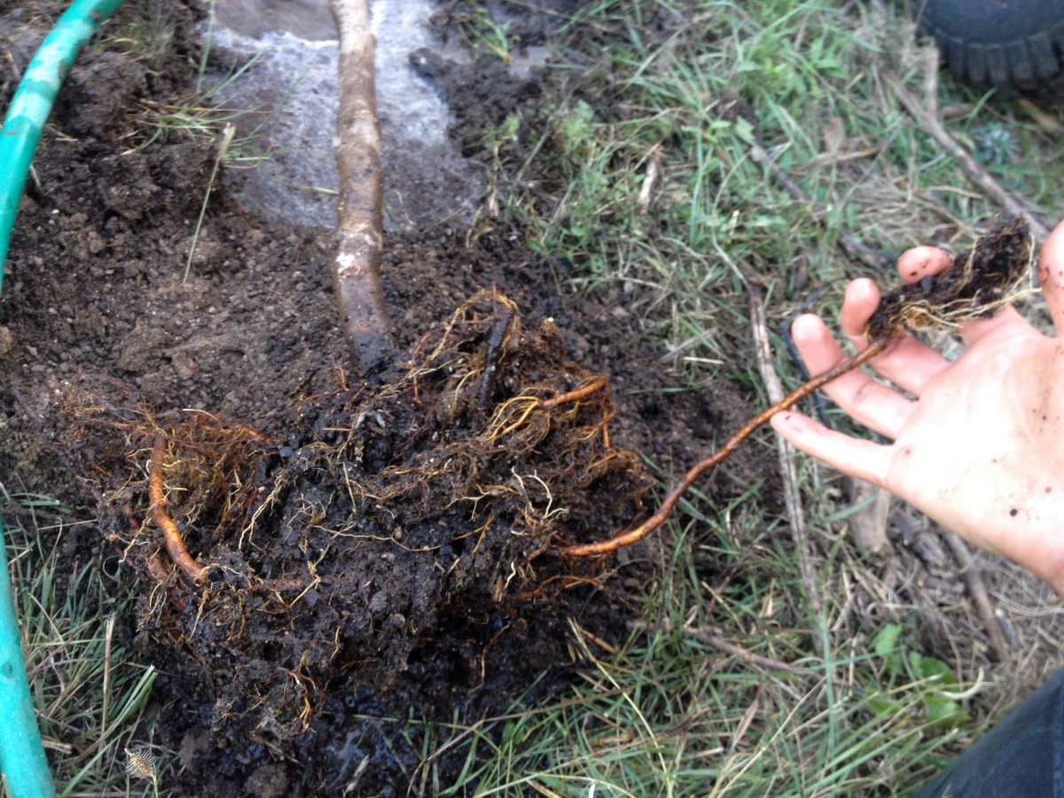 Когда все готово, выбирается прохладный, сырой денек, но без дождя и ливня (с моросью, например) и лопатой в прикорневой зоне яблони крайне аккуратно снимается слой за слоем почва, пока мы не наткнемся на конечные корешки, они, как правило, довольно тонкие, их диаметр может отличаться не сильно, от пяти до восьми миллиметров в самом верхнем срезе.