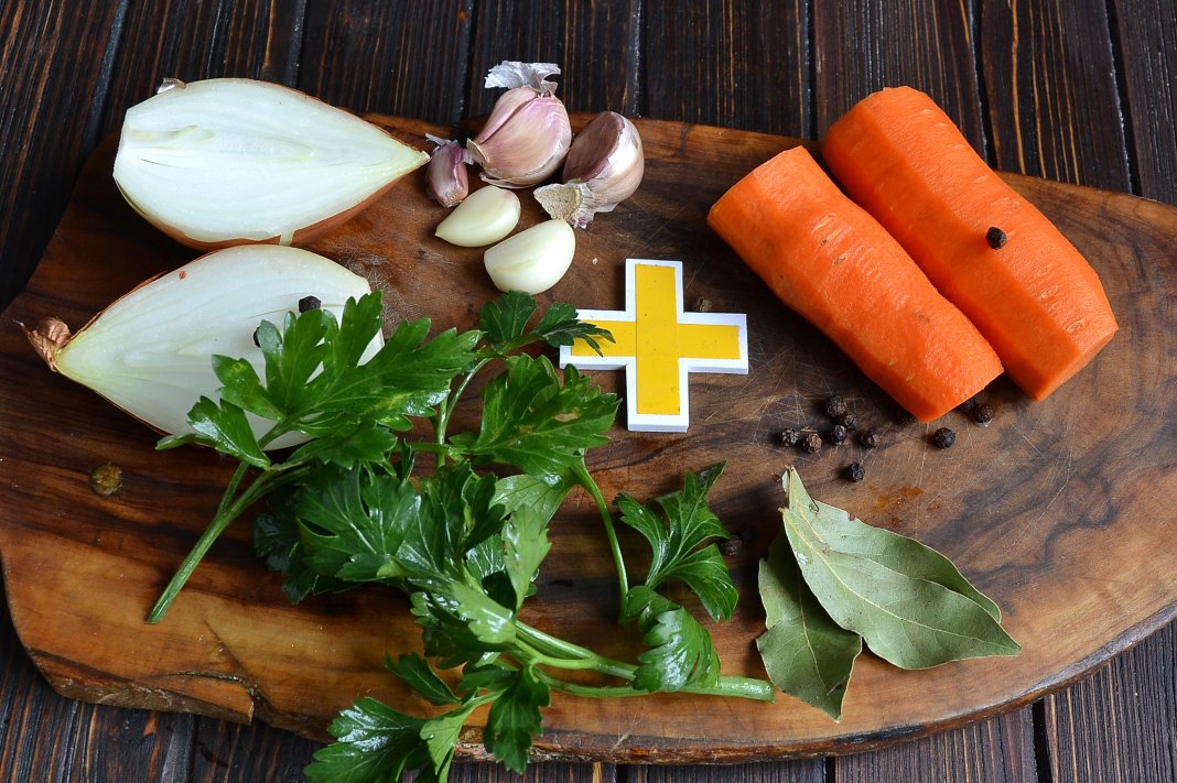 Подготовим ингредиенты для диетического бульона из куриного филе. Морковь чистим, моем, нарезаем крупными брусками или оставляем целой (если корнеплод не крупный). Головку репчатого лука вместе с шелухой разрезаем на 2-4 части. Немного луковой шелухи не повредит: золотистый цвет отвару обеспечен. Зубчики чеснока давим ножом, снимаем шелуху. Лавровые листочки ополаскиваем кипятком, горошины черного перца оставляем целыми.