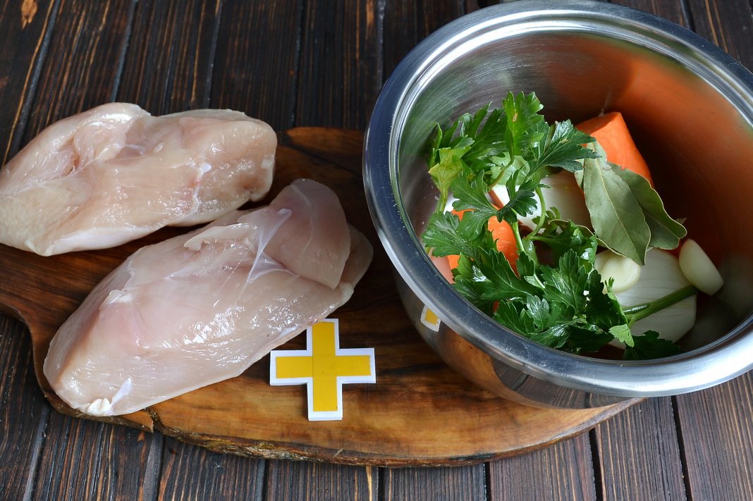 Наливаем в кастрюлю 1.5 л холодной воды, насыпаем примерно 8 г поваренной соли. Ставим кастрюлю на плиту, доводим до кипения на среднем огне, снимаем накипь шумовкой. Уменьшаем газ до минимального, варим 30-40 минут. Оставляем готовую куриную грудку в горячем бульоне на 15 минут, затем мясо достаём, а жидкость процеживаем через сито.