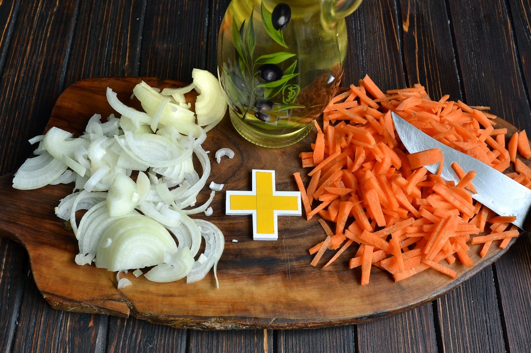 Для супа нарезаем мелкой соломкой морковь, мелко рубим репчатый лук. Пассеруем овощи в рафинированном оливковом масле 10 минут.