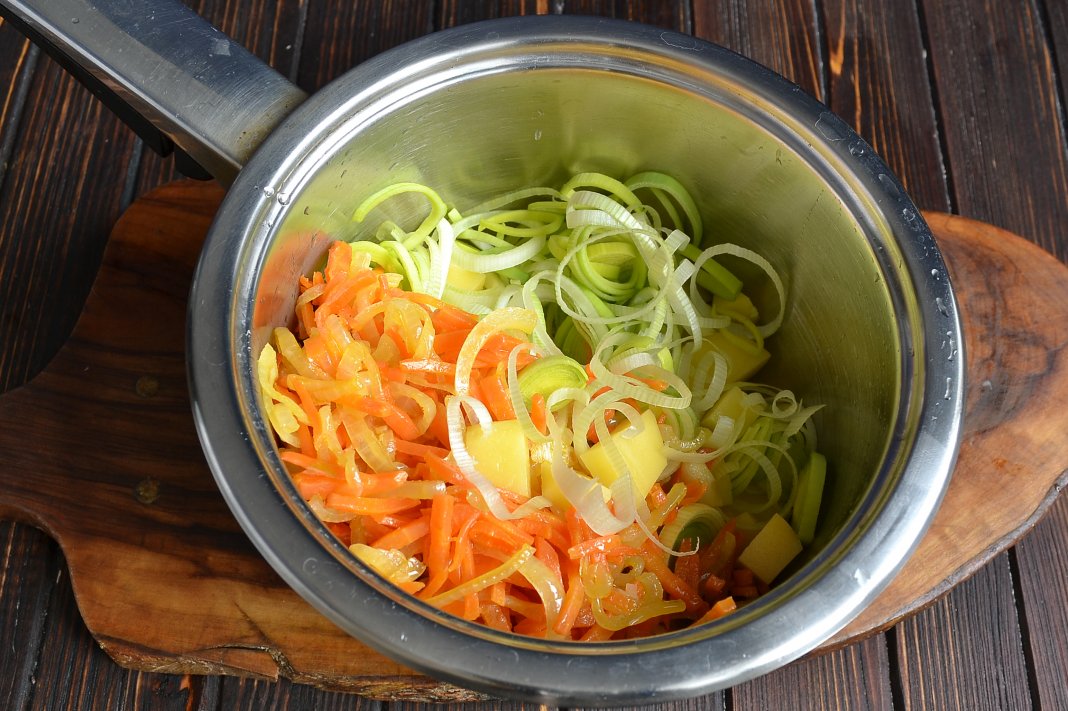 Кладём в суповую кастрюлю пассерованные овощи, добавляем лук порей и картофель.