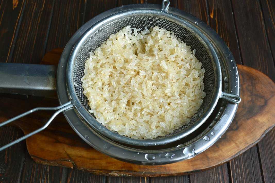 Пропаренный рис готовим отдельно. Сначала заливаем крупу холодной водой, промываем несколько раз, пока вода не станет совсем прозрачной. Наливаем в кастрюльку 200 мл воды, добавляем промытый рис. После закипания закрываем плотно крышкой, варим на медленном огне 15 минут.