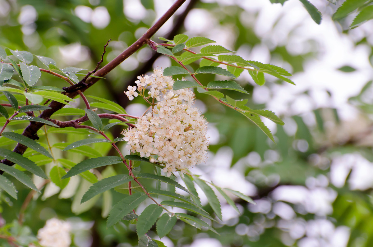 Цветки белые, душистые, собранные в щитки. Плоды, имеющие оранжево-красный или красный цвет, появляются одновременно с осенним преображением листвы.