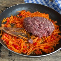 Обжариваем овощи на умеренном огне до мягкости. На это уйдет примерно 12 минут. Когда морковка станет мягкой, кладём в сковороду охлажденный фарш из говядины.