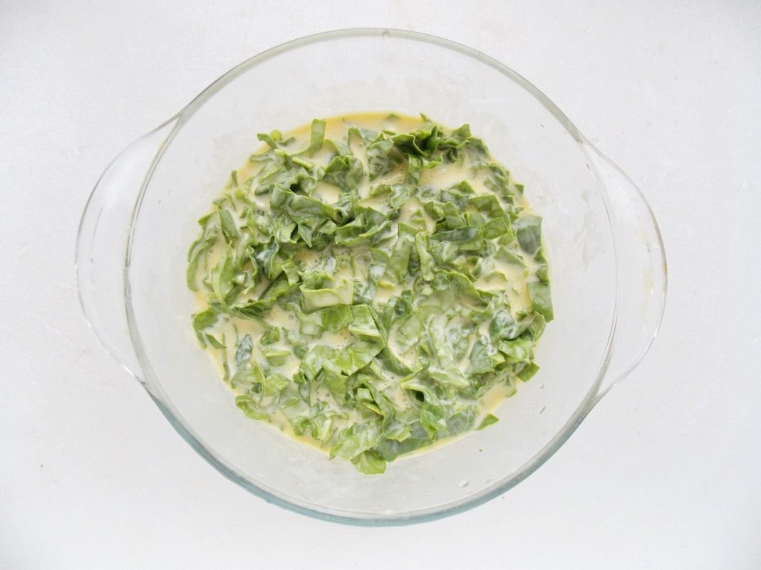 Добавляем нарезанный шпинат ко взбитым яйцам и перемешиваем.