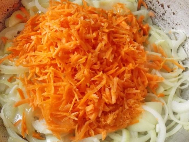 Сняв со сковороды рыбу, подливаем растительного масла и выкладываем лук. Помешивая, пассеруем лук до мягкости и добавляем тёртую морковку.
