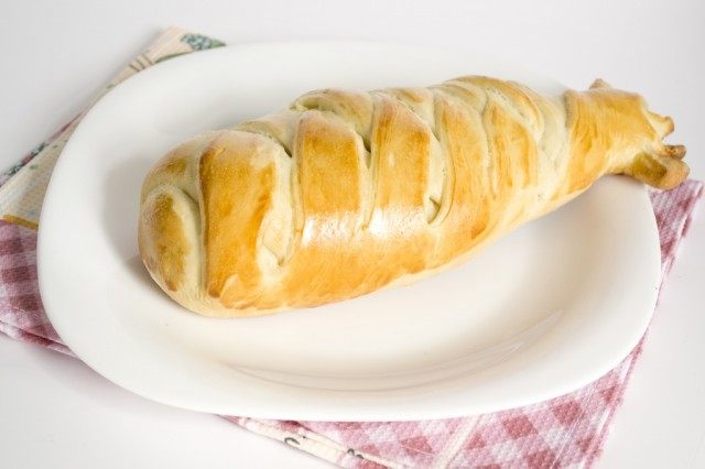 Старайтесь поместить рыбу так, чтобы края теста поднимались примерно на 1.5-2 сантиметра вверх. Если отверстия в косичке будут располагаться низко, то сок из начинки рыбного пирога во время выпечки вытечет на противень.