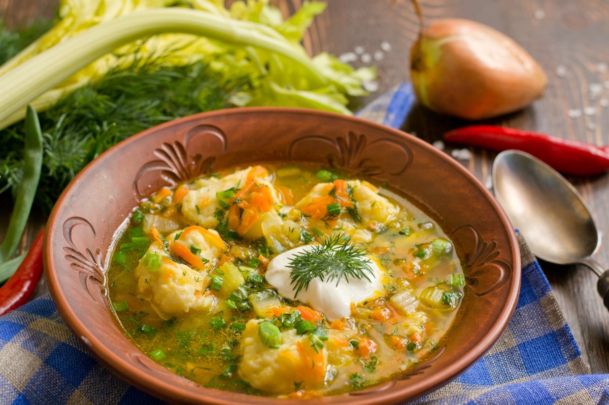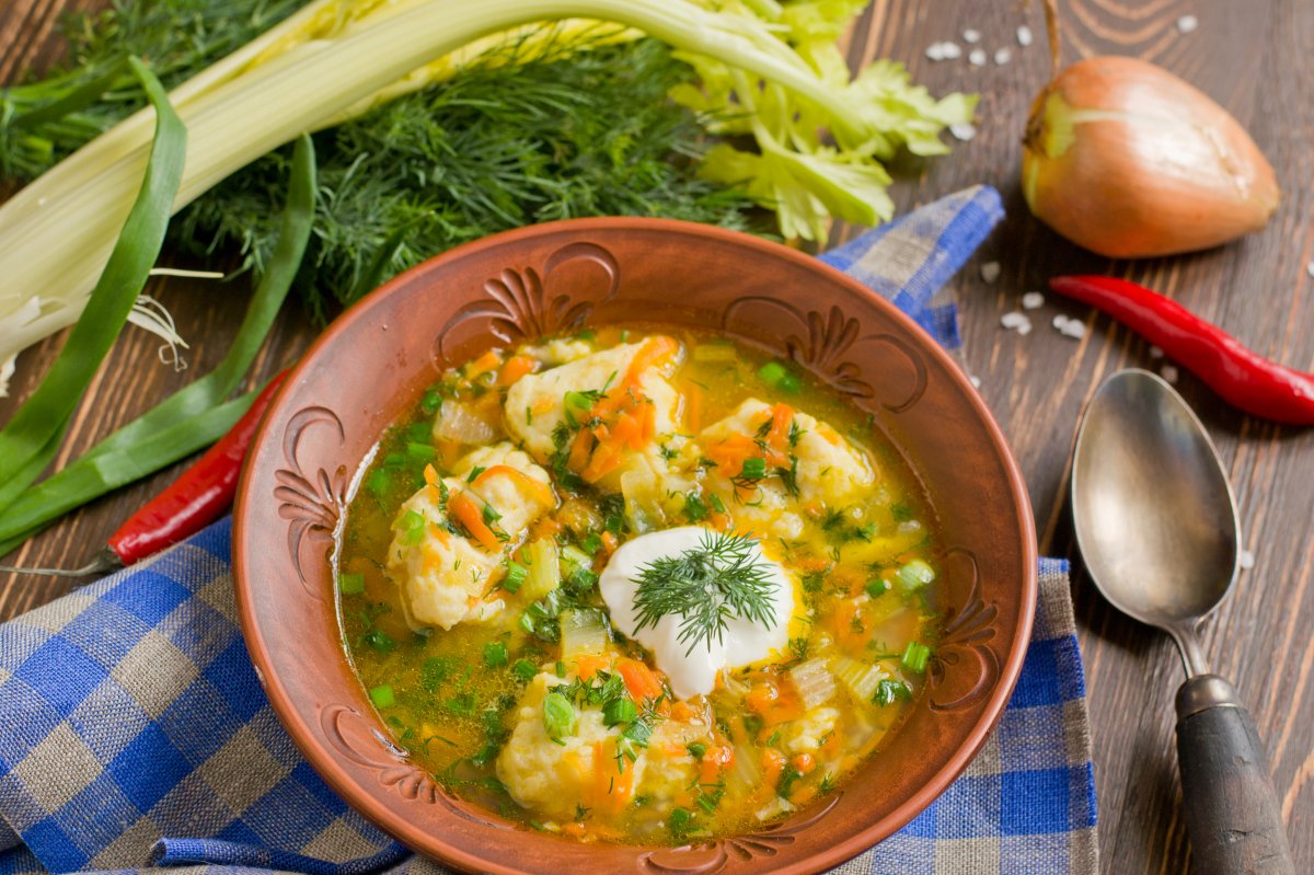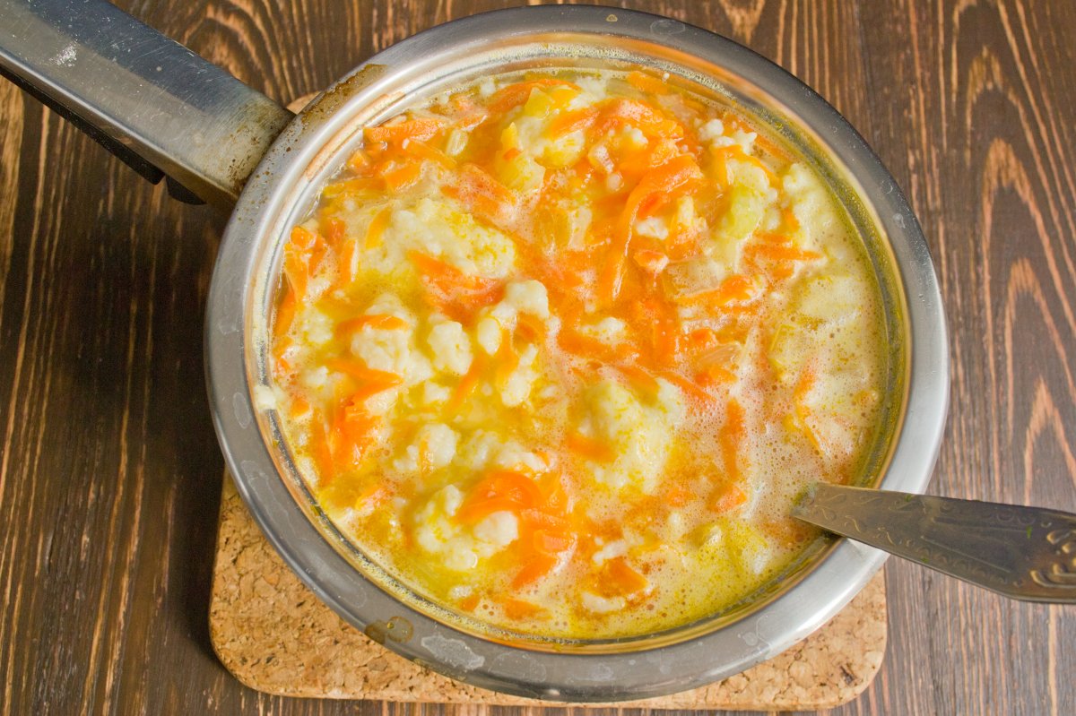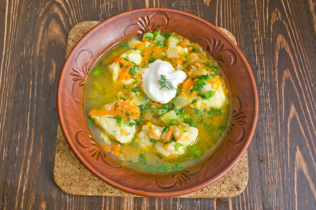 За 5 минут до готовности кладём в сотейник картофельные клёцки, как только они всплывут на поверхность и супчик вновь закипит, снимаем сотейник с плиты.