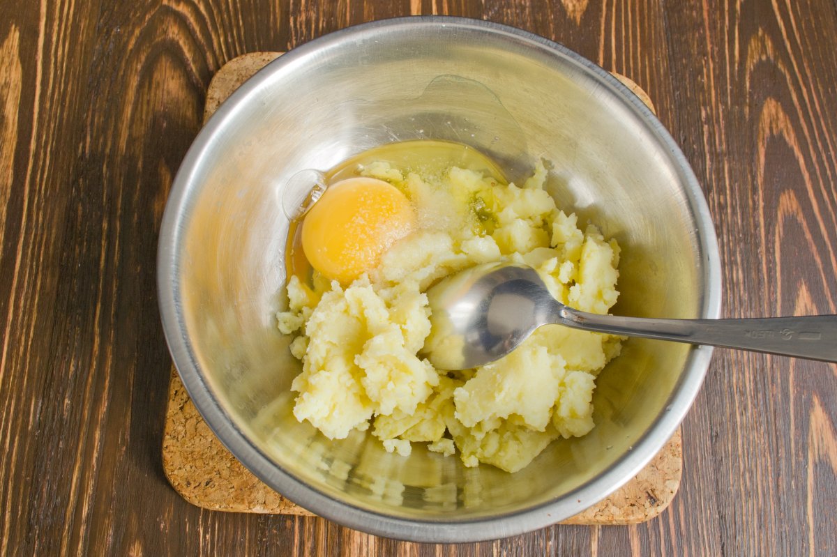 Делаем картофельное тесто для клёцек. Разминаем варёный картофель, добавляем сырое яйцо и соль по вкусу. Также можно использовать для приготовления теста и остатки пюре.