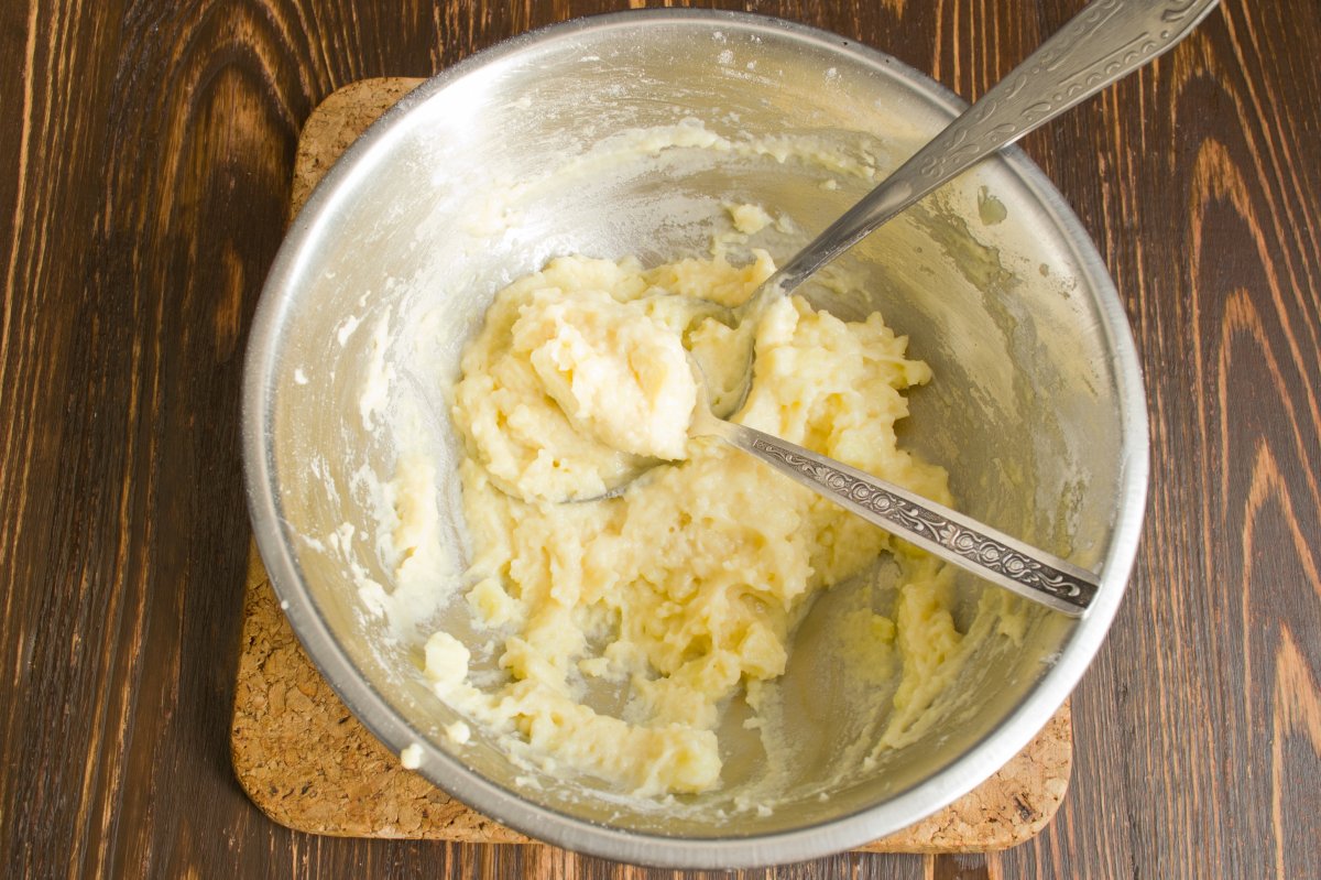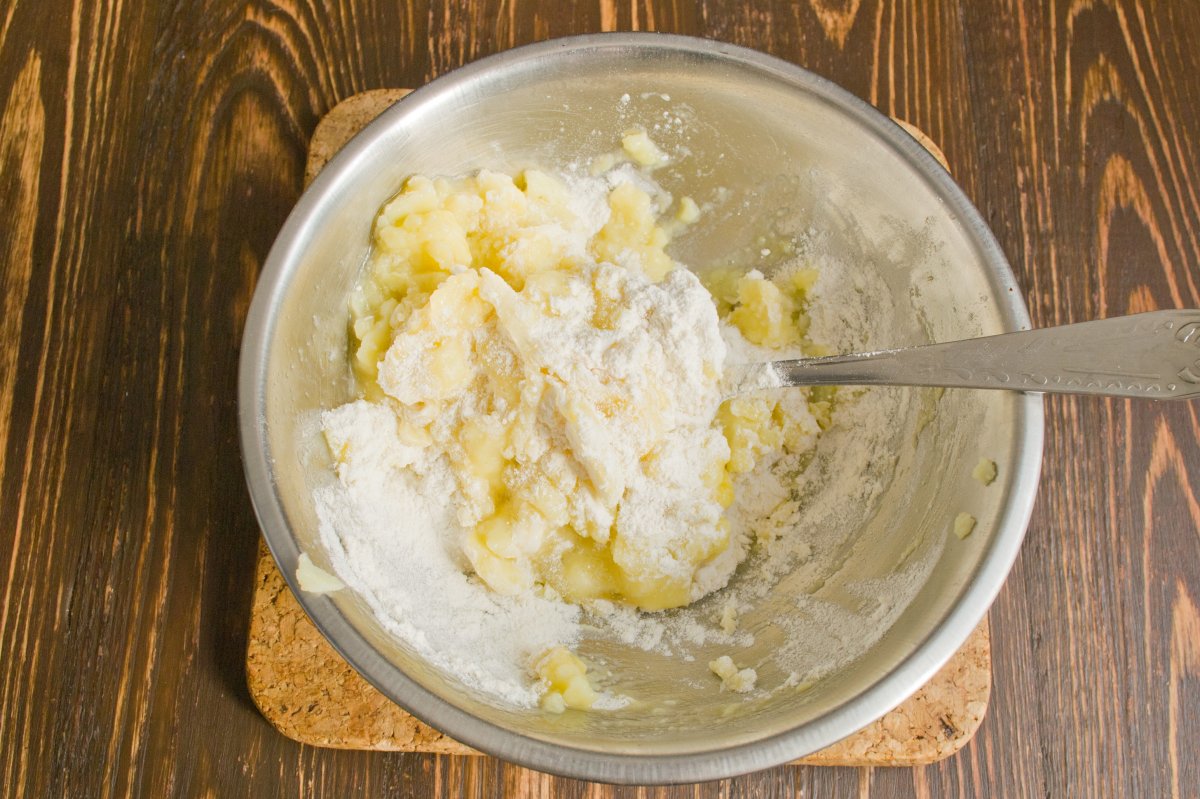Перемешиваем картошку с яйцом до однородного состояния, насыпаем пшеничную муку и тщательно перемешиваем, чтобы получилось гладкое тесто без комков муки.