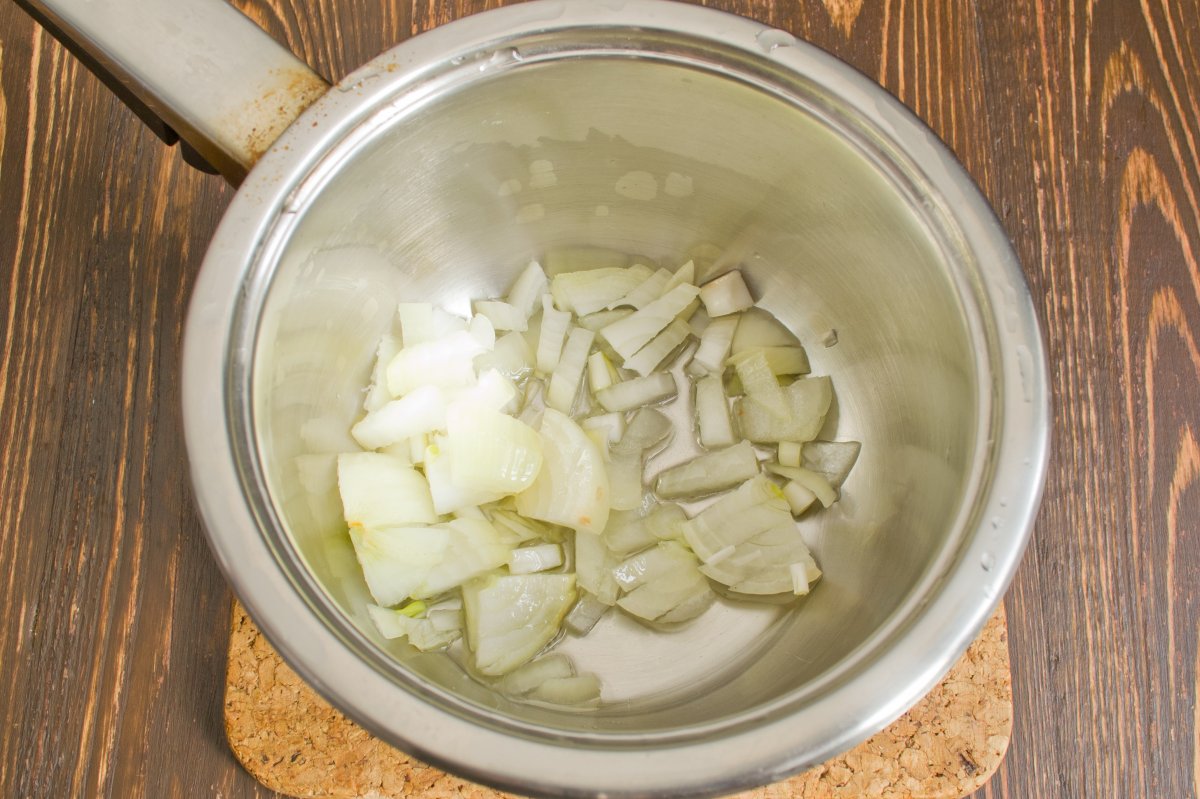 В сотейник наливаем немного растительного масла для жарки (без запаха). Затем растапливаем столовую ложку сливочного масла. В растопленное масло кладём порубленный мелким кубиком репчатый лук.