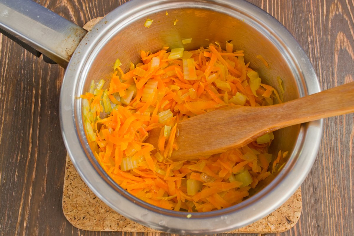 К луку добавляем нарезанную тонкой соломкой морковку и стебли сельдерея, порезанные кубиками. Пассеруем овощи 15 минут, пока они не станут мягкими.