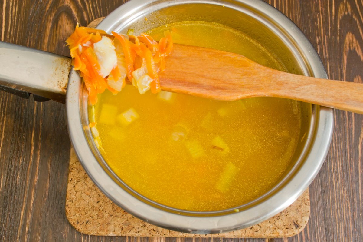 Рыбный бульон процеживаем, нагреваем до кипения, отставляем сотейник в сторону.