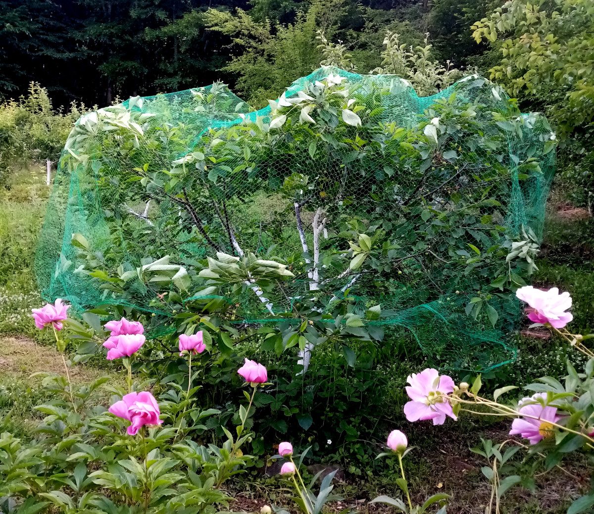 Сетками от птиц укрываем вишню и черешню. Ради этого приходится формировать деревца невысокими — не выше 2 метров, и неширокими — примерно 2,5 м в диаметре. С сетками на деревьях пока получается не совсем удачно. Пока зреют плоды, молодые побеги ухитряются прорасти в ячейки сетки и потом, при снятии, часть обрывается. Кроме того, птицы не могут добраться не только до плодов, но и до насекомых, которые под защитой сетки совершенно распоясываются. В нашем случае самые вредоносные — мраморные клопы. Пробуем феромонные ловушки.