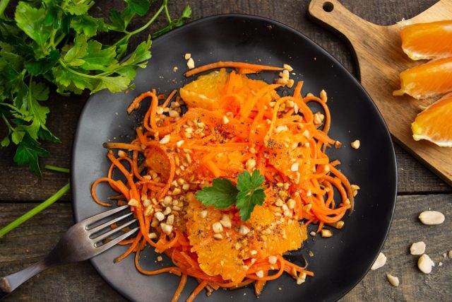 Салат из моркови с апельсином – витамины в тарелке. Нет ничего проще этого рецепта, за 5-10 минут получается яркий и по вкусу, и по цвету салатик, который можно съесть как самостоятельное блюдо или подать к мясу, птице, рыбе. В рецепте есть орехи, я готовила с арахисом, но вы можете посыпать салат любыми жареными орешками, которые найдутся дома. Салат кисло-сладкий, его можно «ужесточить» щепоткой острого перца, это по желанию.