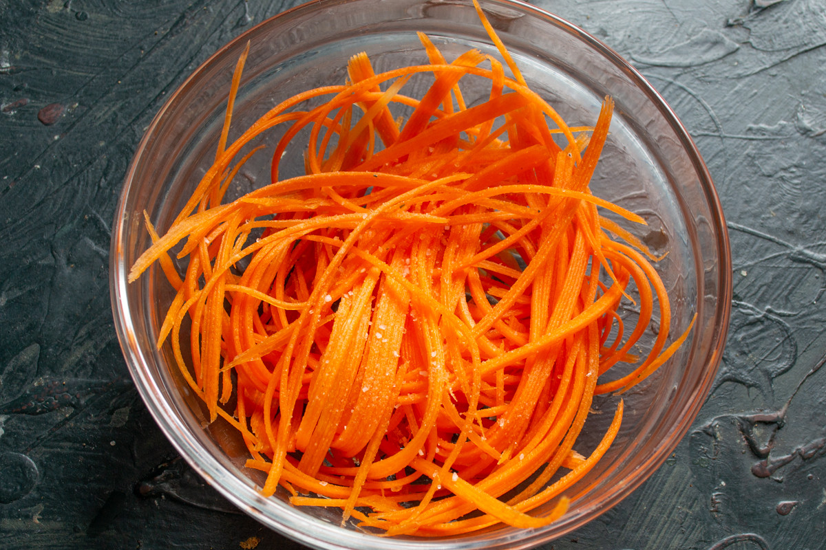 Морковь скоблим и с помощью овощного скребка или тёрки для морковки по-корейски натираем длинными узкими стружками. Самую сердцевину моркови я в салате не использую, оставляю для бульона.