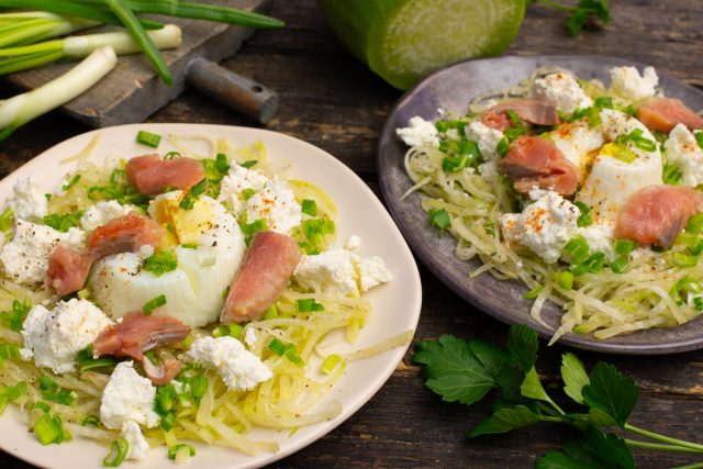 Салат из редьки с творогом и красной рыбой – полезный завтрак, в котором есть полный набор необходимых витаминов и минеральных веществ, чтобы получить заряд бодрости и начать новый день с улыбкой! Острая, резкая редька, нежный, чуть кисловатый творог, кремовое яйцо-пашот и слабосоленая рыбка, это действительно невероятно вкусно! Конечно, если ваша работа связана с общением с людьми, то лук и редька с утра не каждому подойдет, но если отбросить комплексы, то почему бы нет! Попробуйте, это очень аппеттно!