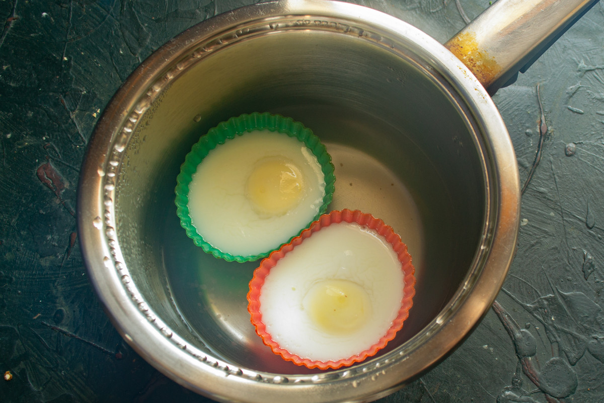Варим яйца-пашот. Капелькой растительного масла тщательно смазываем силиконовые формочки. Разбиваем яйца в формы, ставим в кастрюльку. Вливаем кипяток примерно до половины формочек, плотно закрываем кастрюльку крышкой. Готовим 2-3 минуты. Достаём, проводим черенком вилки вдоль края, достаём яйца. В приготовленном таким образом яйце желток остается мягким.