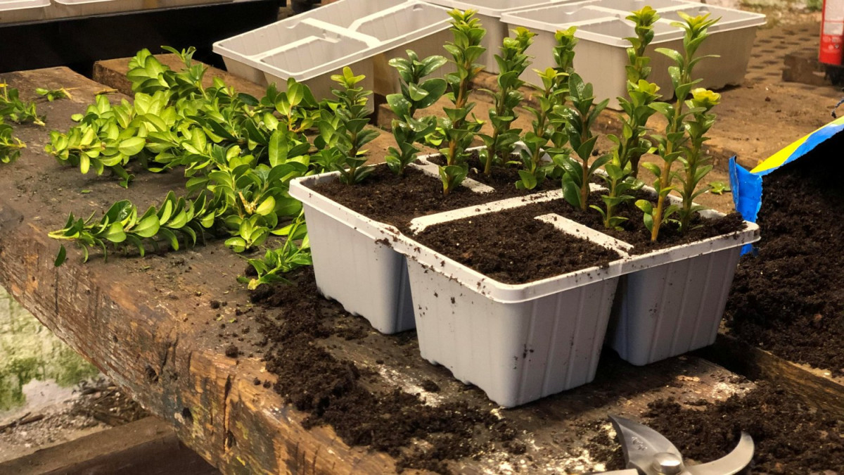 - Корни появятся примерно через месяц. Когда их длина станет не менее 5 см, пересадите черенки в контейнеры или ящики для доращивания. Тару поместите в тёплом, хорошо освещённом месте и не забывайте регулярно поливать ростки. В постоянные горшки саженцы пересадите весной следующего года или, если они быстро подросли, в начале осени текущего года.