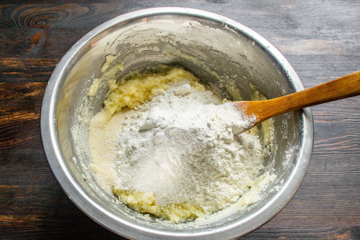 Добавляем к масляно-сахарной смеси творог, смешиваем. Творог нужен мягкий без комков, если есть крупинки, протрите творог сквозь сито или пропустите через мясорубку.