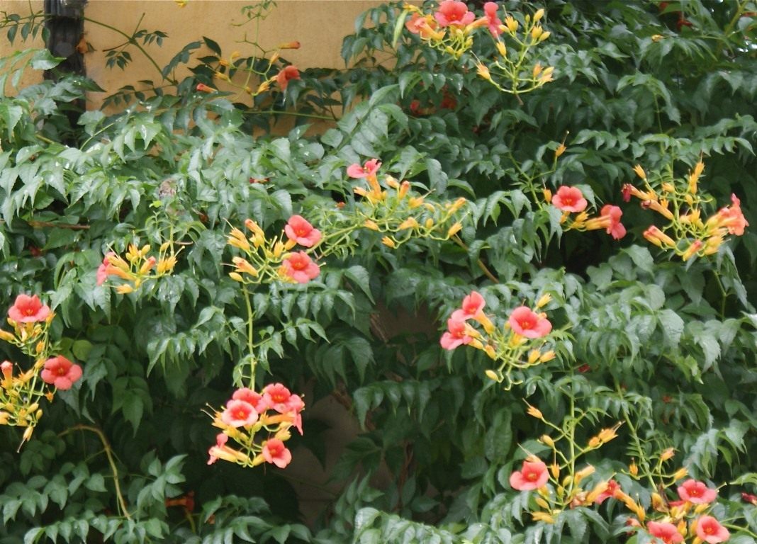 Кампсис укореняющийся, или Текома красивы, но у них очень мощная корневая система, да и сама лиана способна раздвигать (ломать) многое, куда она вначале залезла тоненьким прутиком.