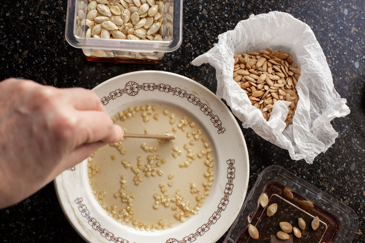 Сначала семена осматривают и сортируют. Все поломанные, пустые, тёмные, с чёрными точками и механическими повреждениями отбраковывают. Оставляют равномерно окрашенные, цвета, соответствующего виду растения, целые. У кабачков, тыкв, патиссонов и некоторых других культур они должны быть «толстенькие».