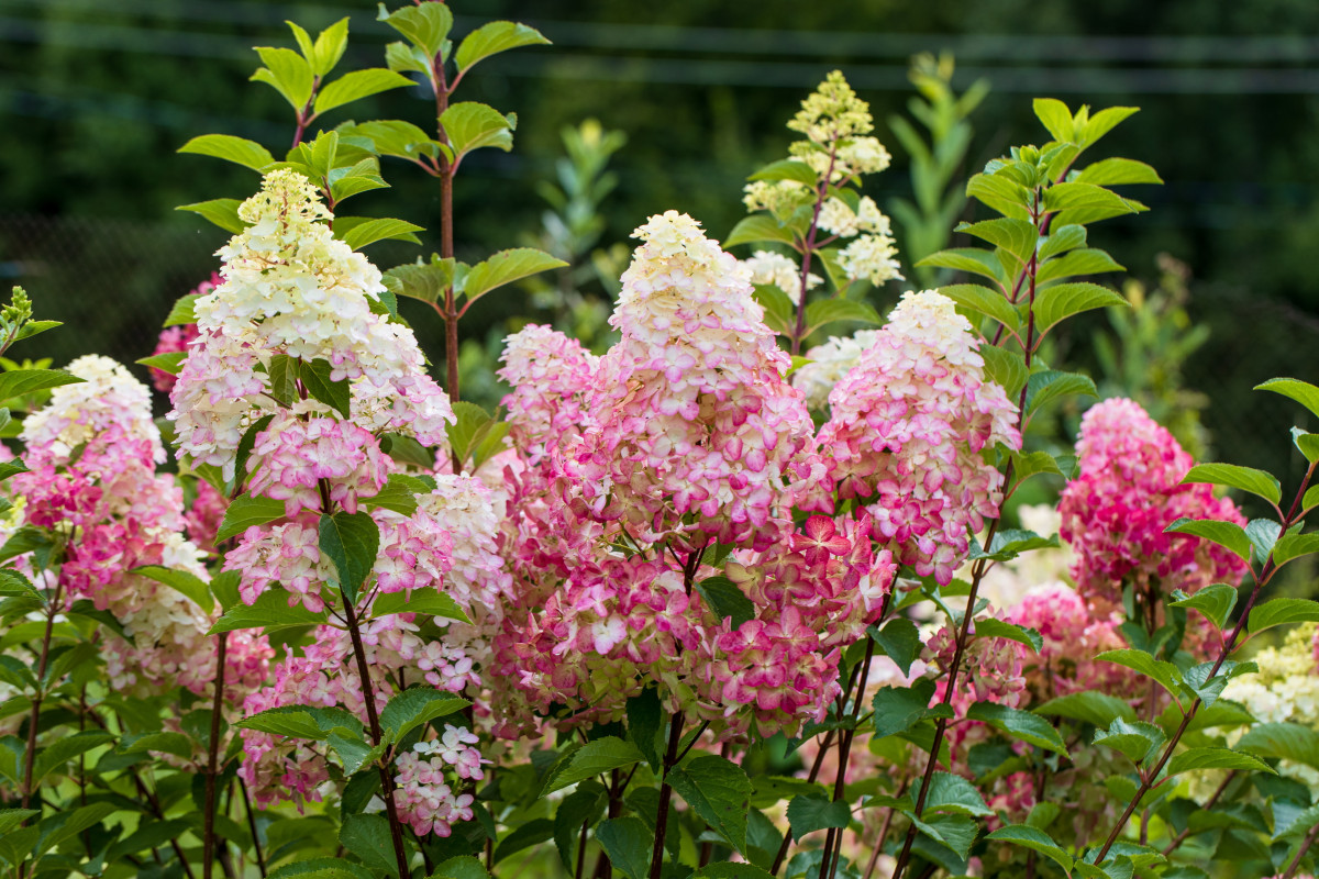 Метельчатые гортензии очень популярны в саду благодаря коническим соцветиям оттенков малинового.