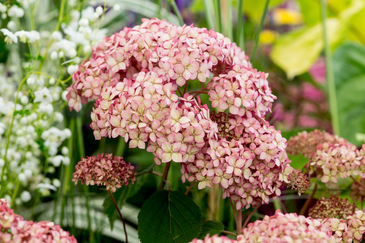 Древовидные гортензии известны огромными, сферическими соцветиями белого и розового цвета.