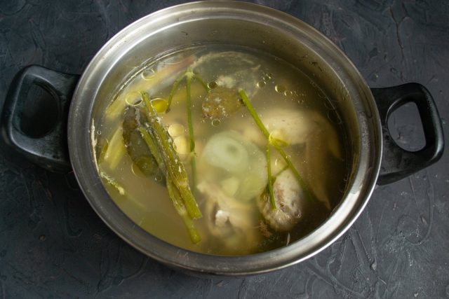 Наливаем процеженный куриный бульон, ставим на плиту, на сильном огне доводим до кипения.