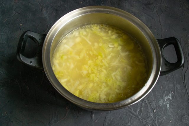 Шинкуем раннюю капусту тонкими полосками, добавляем в кастрюлю к нарезанному картофелю и луку.