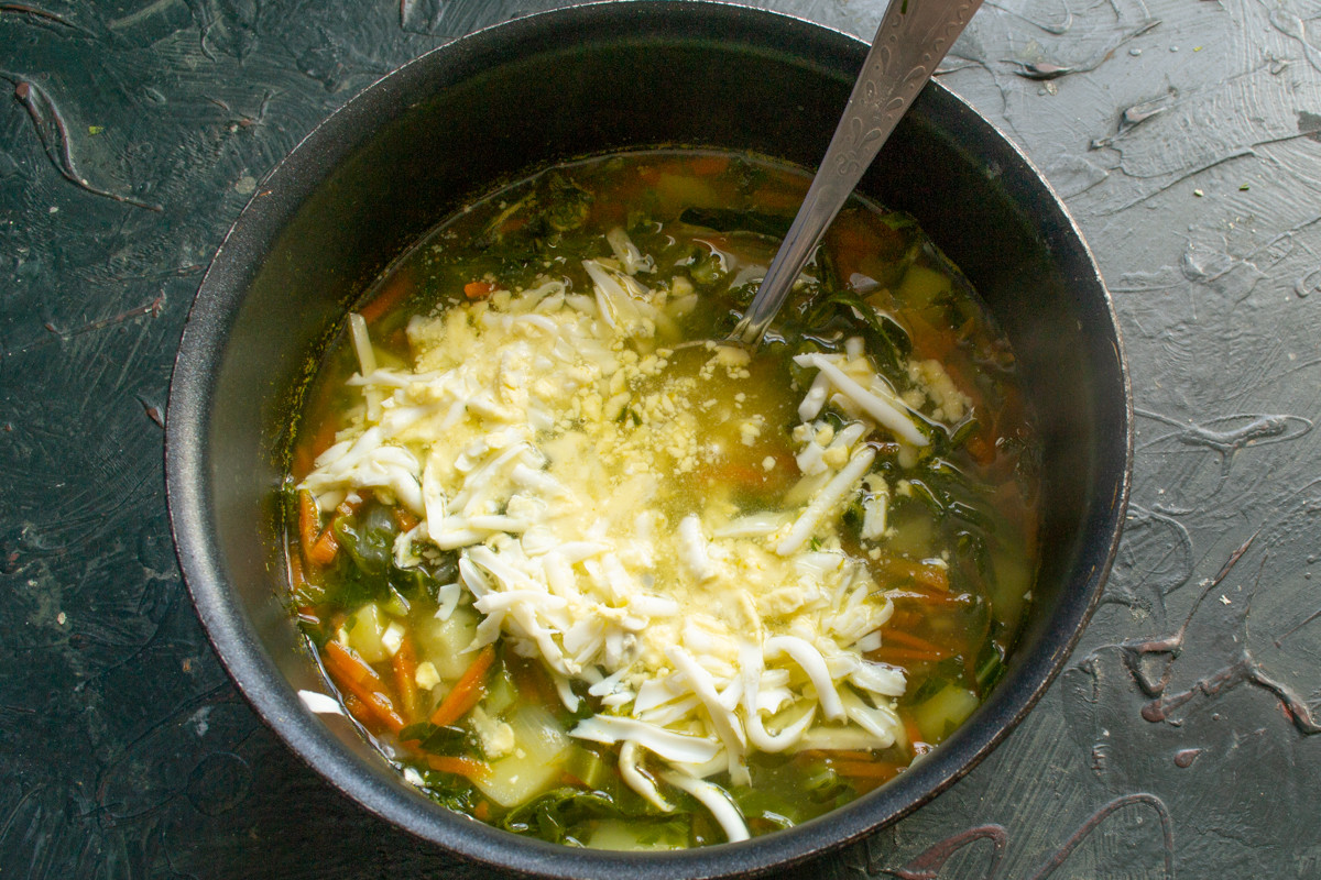 Сваренные вкрутую куриные яйца натираем на крупной тёрке или рубим ножом, добавляем в щи в конце готовки. Как вариант, варёные яйца можно разрезать пополам и положить в каждую тарелку, как в щавелевый суп.