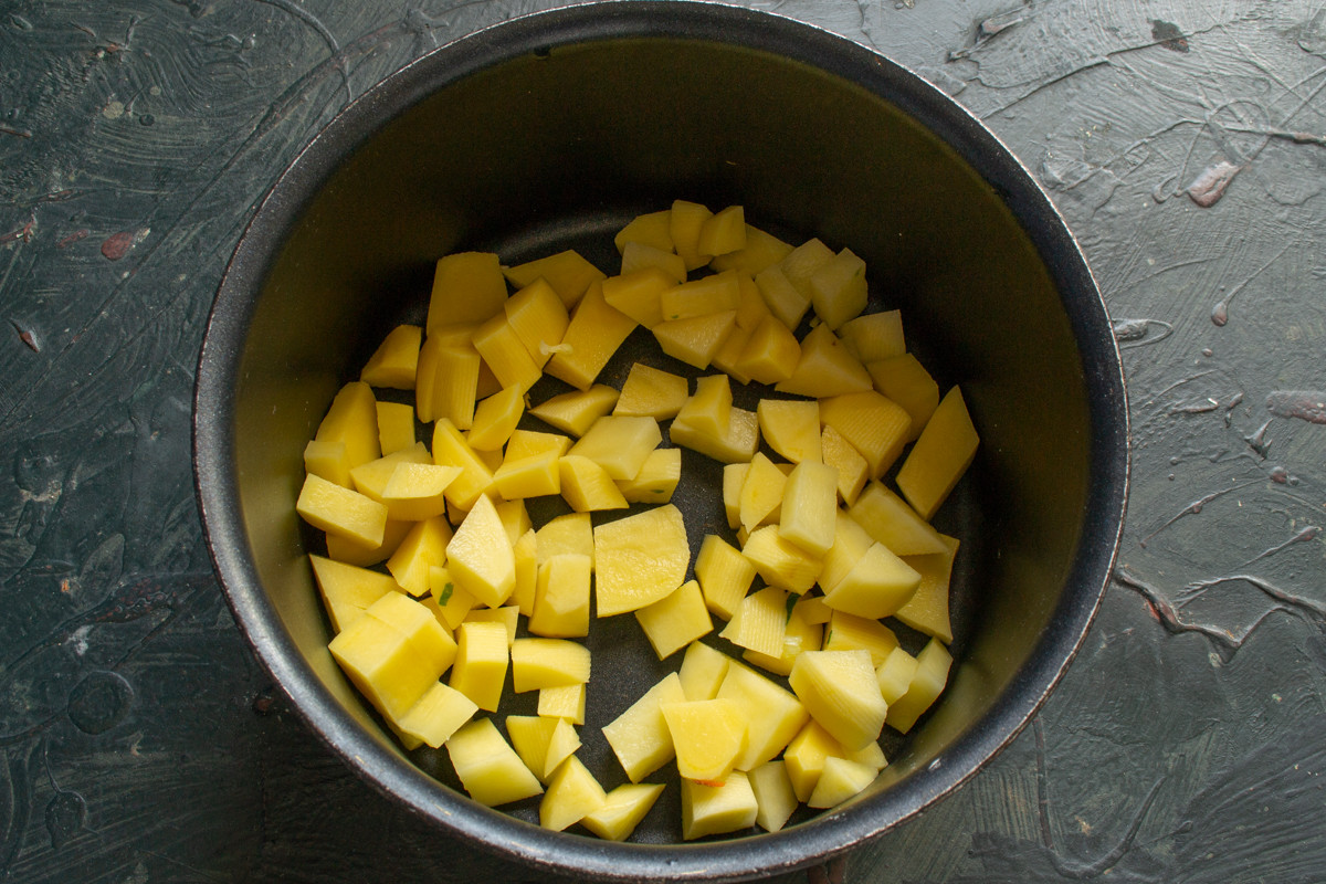 Нарезаем картофель небольшими кубиками. Чтобы суп сварился быстро, я режу овощи помельче.